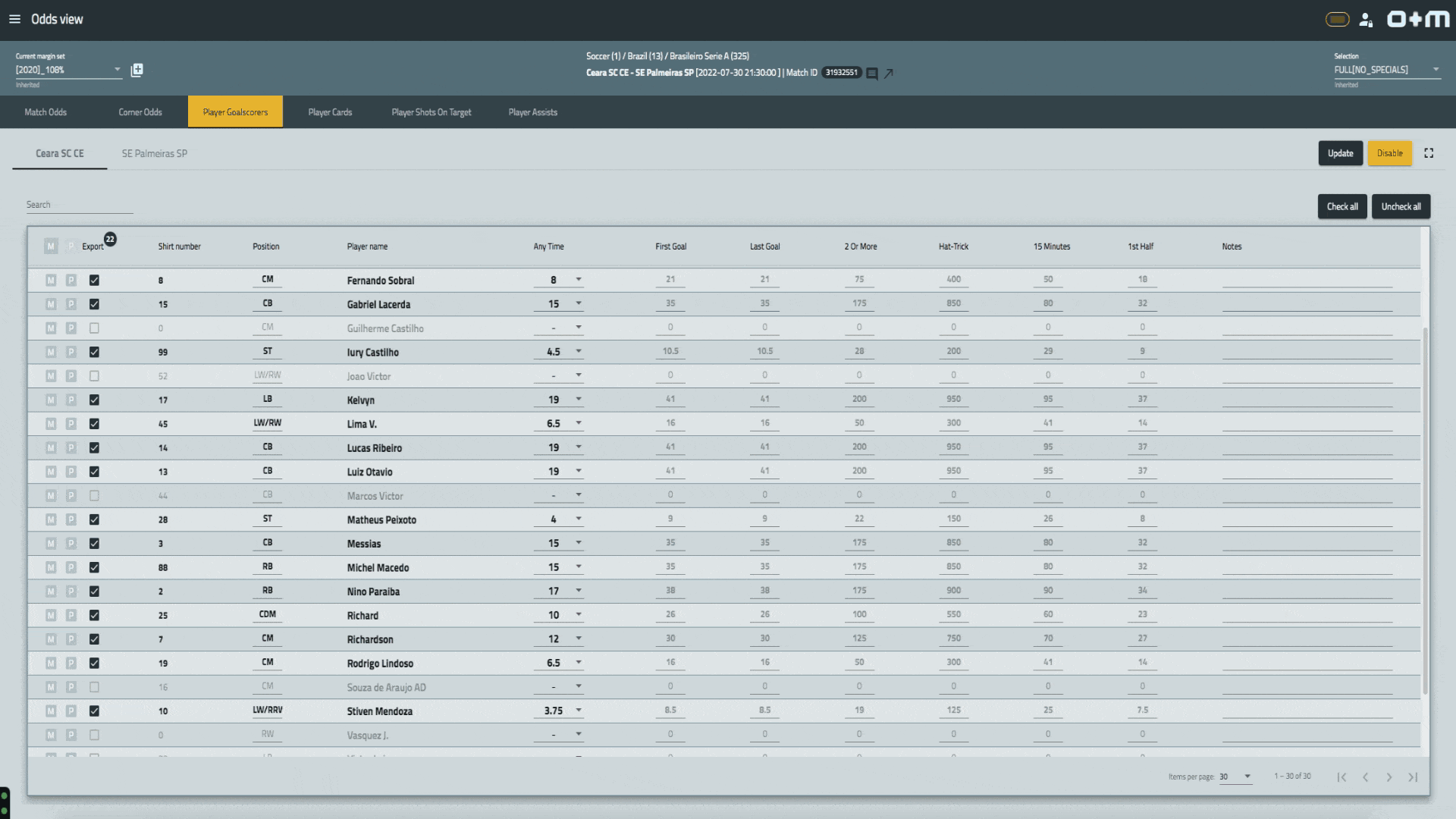 O+M Players provides the bookmaker with a wide range of the odds regarding the “players”and the generation of combination markets such as scorecast and wincast markets. Our team of experts will work with you, constantly monitoring and updating the odds accurately and quickly.Furthermore, the results of events will also be provided. The ‘Players Package’ was made with the purpose of reducing the workload of our clients, and also ensure the service is always up to date with any market changes.