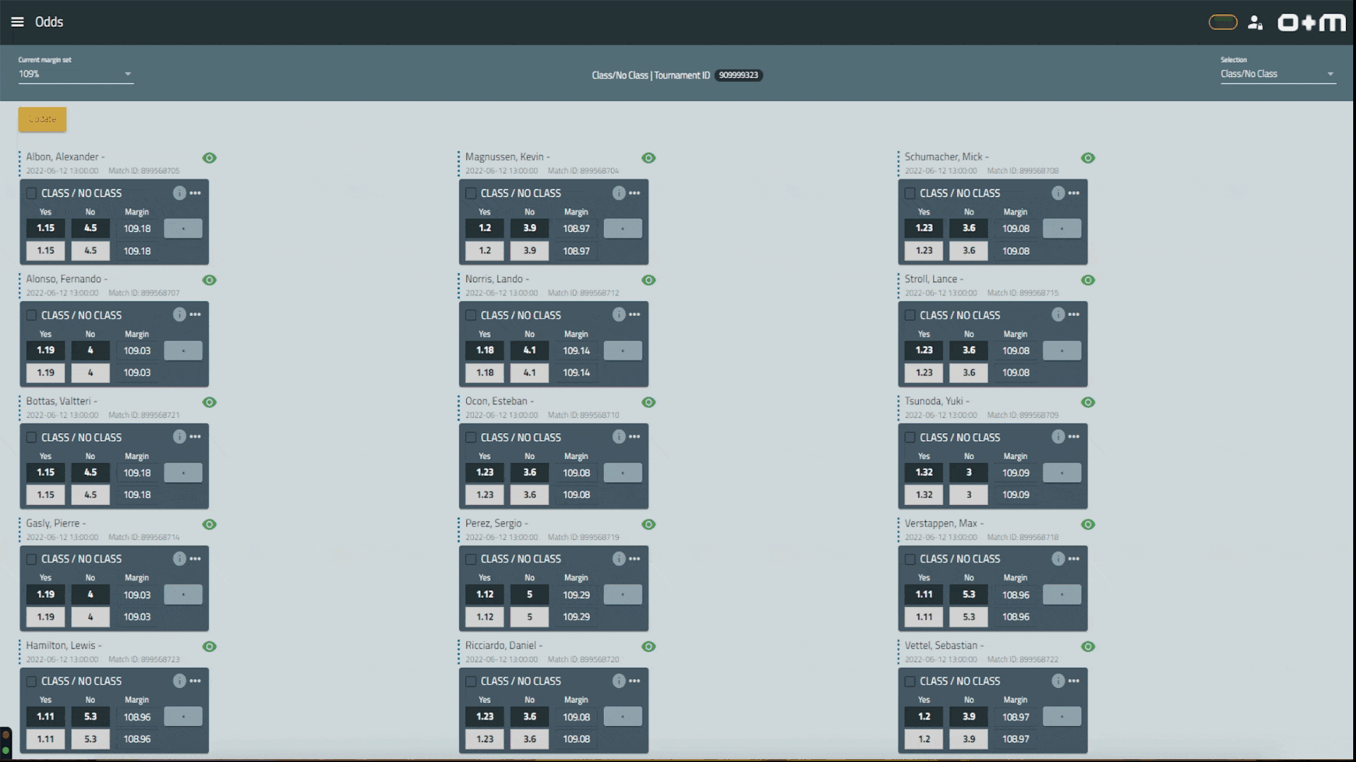 O+M Motors provides the bookmaker of multiple motorsport markets. This offers complete management of the entire cycle of the sports offer, from the creation of an event to the daily odds updates with relative reporting.Thanks to the experts in this field and the precision of our team, the odds offered will be continuously checked and updated. Furthermore, the service can be completely customised – meaning the team can also create the solution that best suits your specific needs.